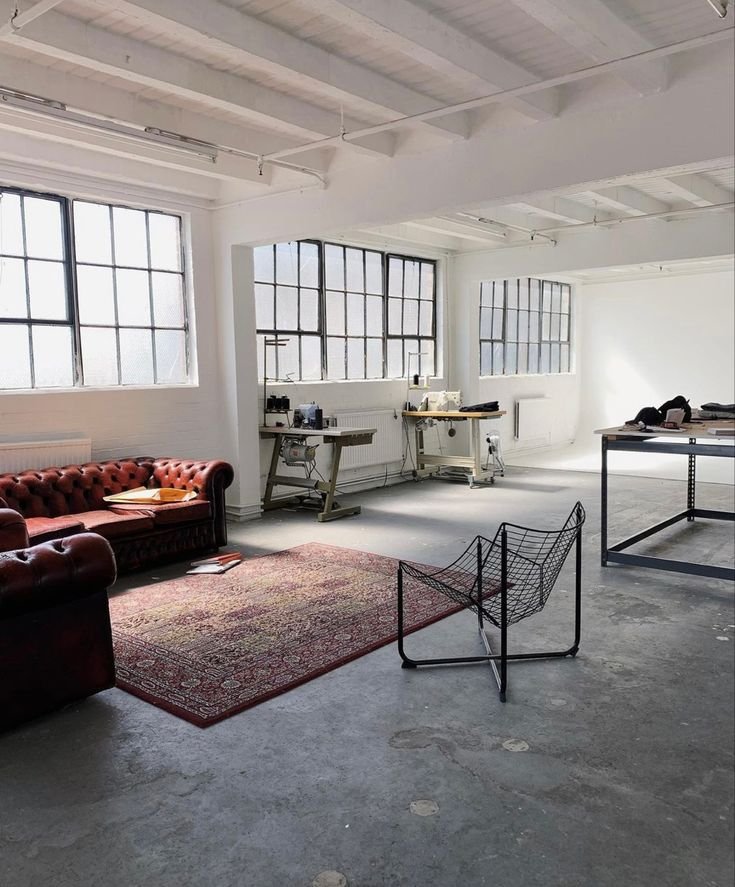 The architecture of Even(t)art House blends industrial charm with modern elegance. Sunlight pours through the expansive steel-framed windows, highlighting the high ceilings with exposed beams and polished concrete floors. A mix of vintage and contemporary furnishings—including a rich leather sofa and minimalist seating—complements the space, offering a warm yet versatile backdrop for any creative endeavor or event.